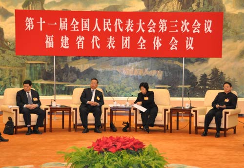 今日下午,參加十一屆全國人大三次會議的福建代表團在人民大會堂福建廳舉行全體會議,并對媒體開放接受記者提問。 福建省委書記,福建代表團團長孫春蘭主持會議。福建省人民政府副省長張昌平、王憲榕、鄧力平、王晶、鄧本元、劉道崎、李建國等代表在會議上發言。部分代表回答記者提問,其中兩岸關系、海西建設等問題最受關注。